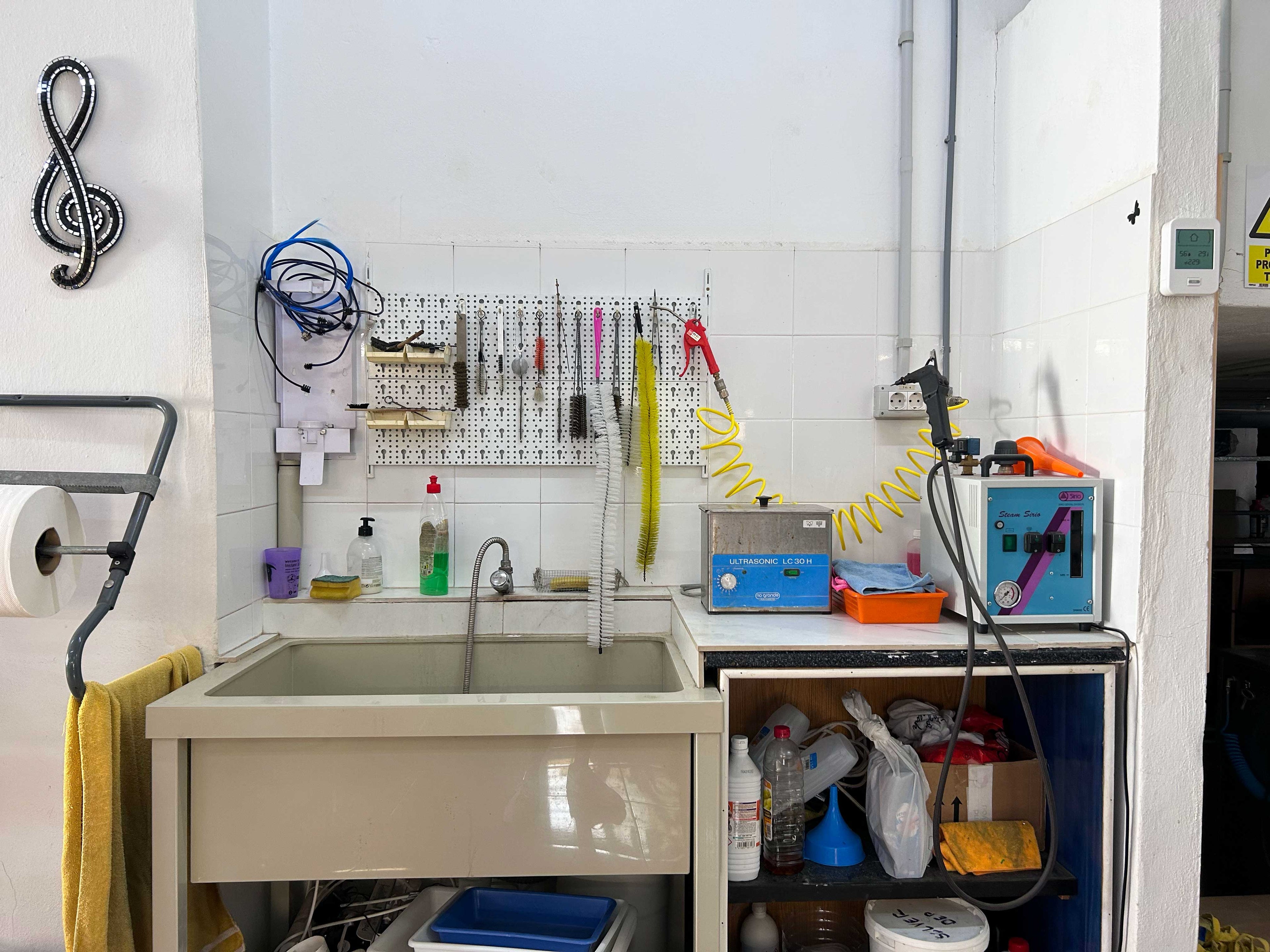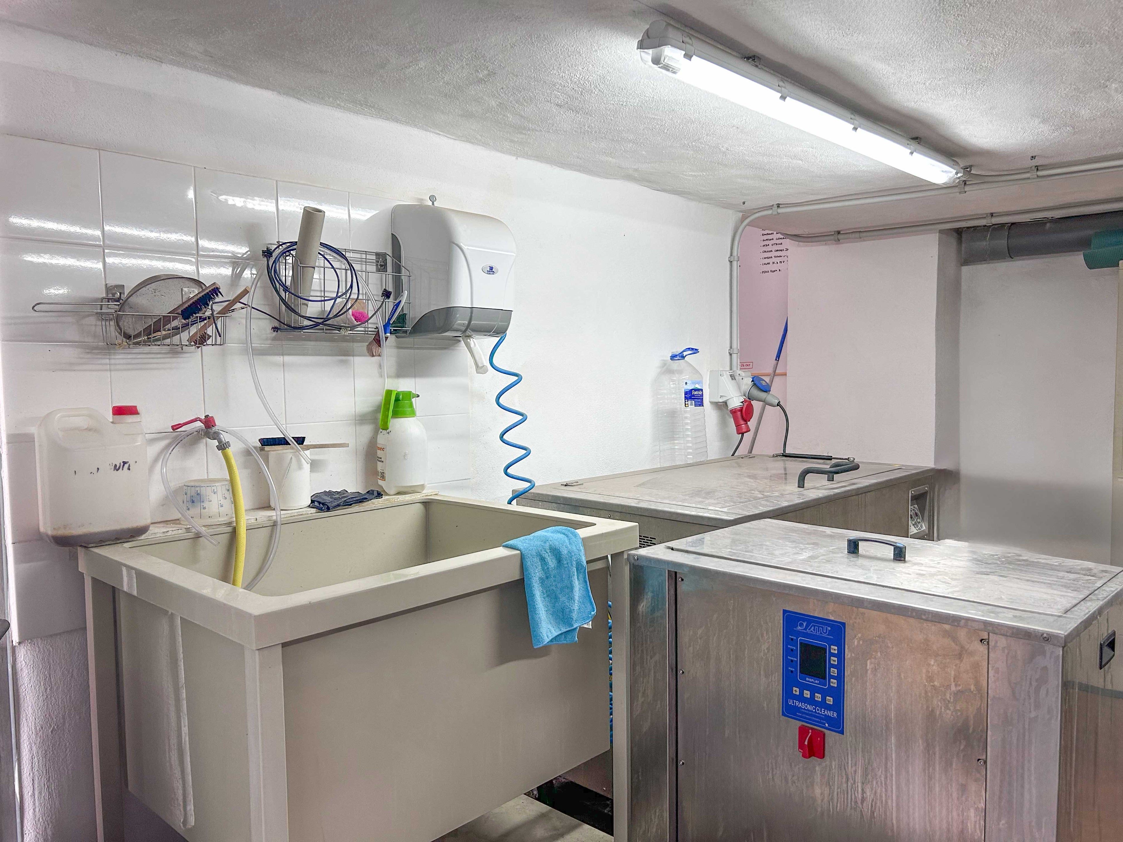 La sección de limpieza es otra joya del taller: varias máquinas de ultrasonidos de altísima tecnología que dejan cualquier instrumento reluciente (sí, incluso esos que parecían haber vivido tres guerras y un carnaval).